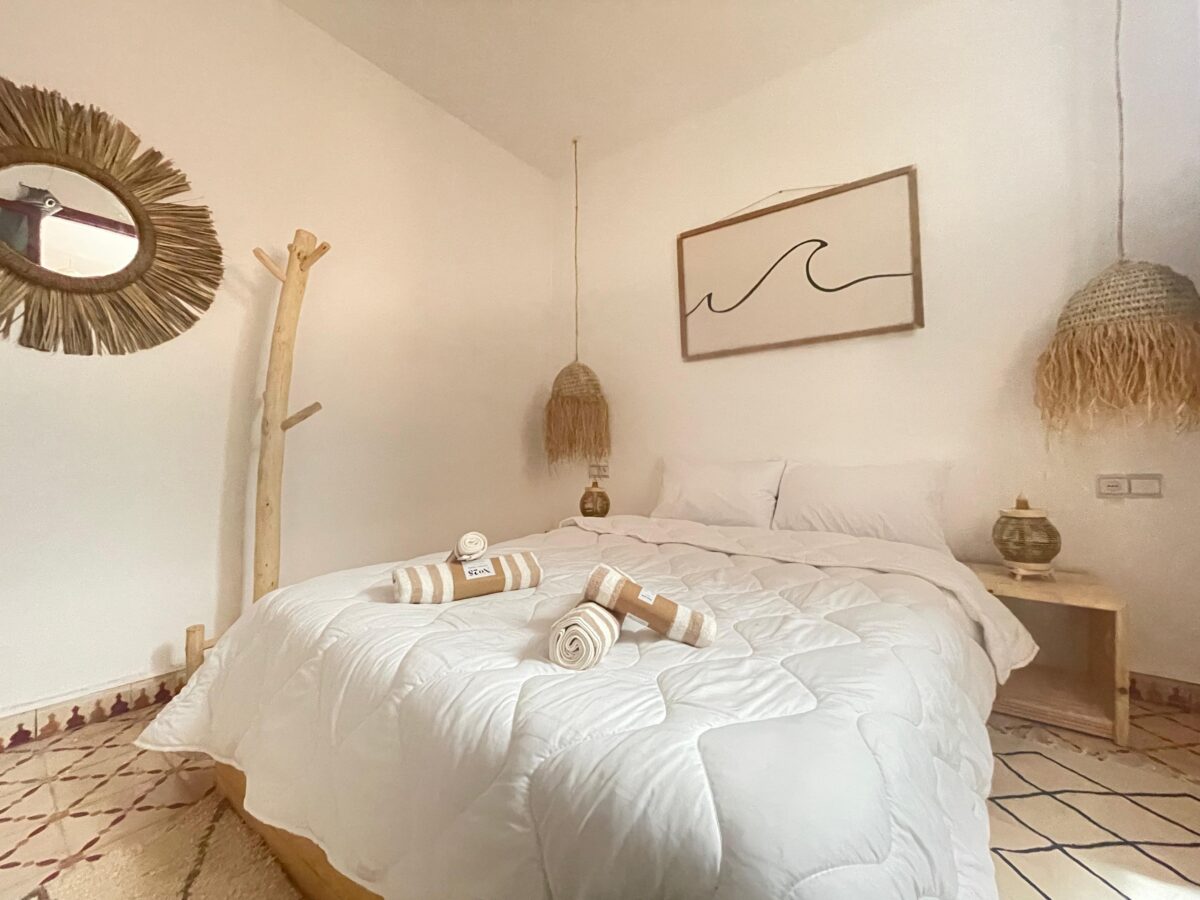 Experience comfort and tranquility in our Azul Double Room, ideal for couples or solo travelers. This inviting space features a cozy double bed with fresh, soft linens, ensuring a peaceful night’s sleep. The room’s minimalist and eco-conscious decor reflects the serene ambiance of Morocco’s coastline, offering a soothing retreat after a day of surfing and exploration.