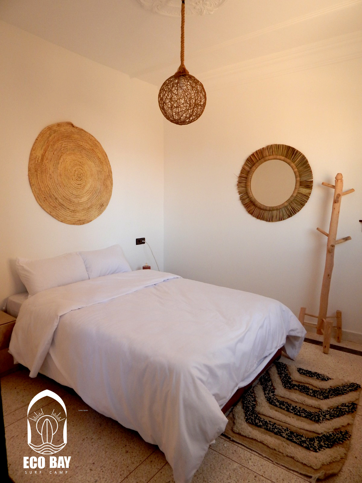 Experience comfort and tranquility in our Tafoukt Double Room, ideal for couples or solo travelers. This inviting space features a cozy double bed with fresh, soft linens, ensuring a peaceful night’s sleep. The room’s minimalist and eco-conscious decor reflects the serene ambiance of Morocco’s coastline, offering a soothing retreat after a day of surfing and exploration.
